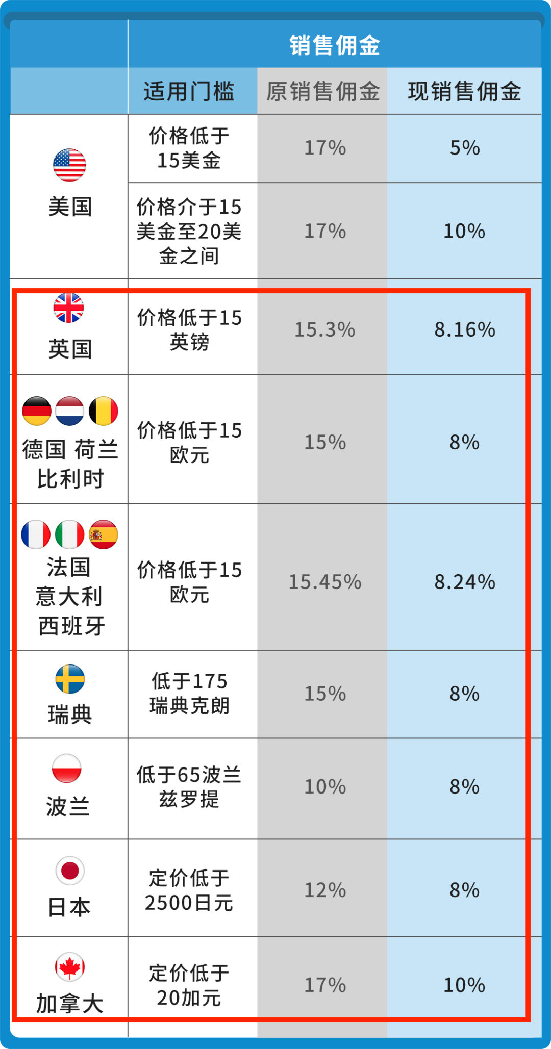 認為這項政策只利好美國站的時候,亞馬遜全球開店今天上午發文稱,不僅僅美國站,歐洲(英國、德國、荷蘭、比利時、法國、意大利、西班牙、瑞典、波蘭)、日本、加拿大都將會大幅下調低價服裝傭金,低到什么地步呢,低至三折起。
