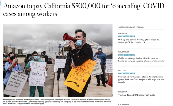 依據訴訟文書表明,亞馬遜在疫情期間瞞報了FBA倉庫內的真正COVID-19病例數,不但沒有向相關衛生機構通報感染狀況,同樣的也并沒有告知倉庫工人并做出相對應對策。在加利福尼亞州的約150個FBA倉庫和其他配送站點設施中,最少發生了19起感染和相關的死亡事件。而亞馬遜工人和衛生部門都未曾獲得真正的數據,這也是亞馬遜在疫情管理方面的嚴重失職。